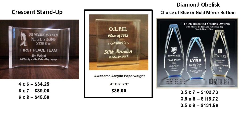 Beautiful lasered acrylics (engraved on reverse side) are an elegant award.